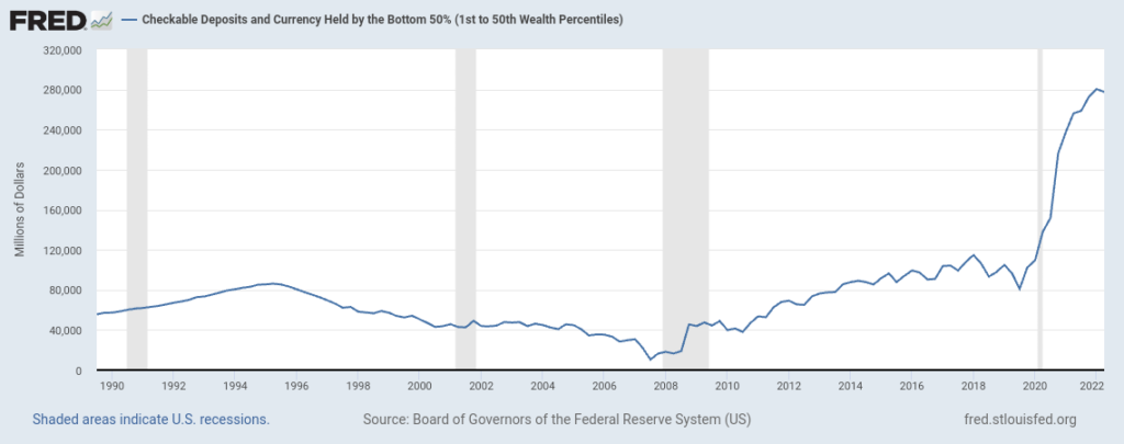 Esta es la cantidad de dinero en forma de depósitos bancarios que son propiedad del 50% de la población que se encuentra en la parte inferior de la distribución de la riqueza, es decir, desde el percentil 1 al 50, así como la cantidad de moneda física (billetes y monedas) que tienen en su posesión.