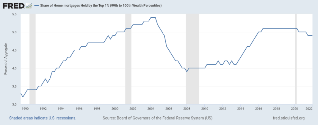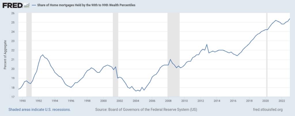 El gráfico a continuación muestra la proporción de hipotecas residenciales que son propiedad del 9% de la población que se encuentra justo debajo del 1% más rico. Es decir, desde el percentil 90 al 99.