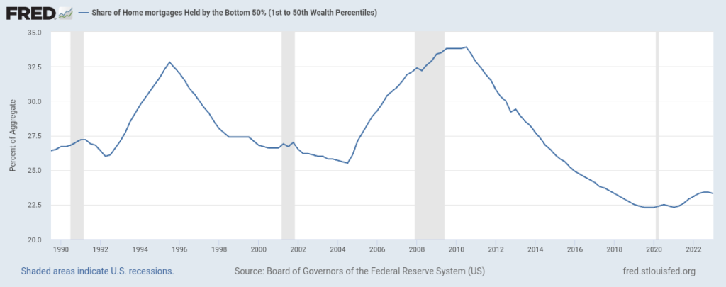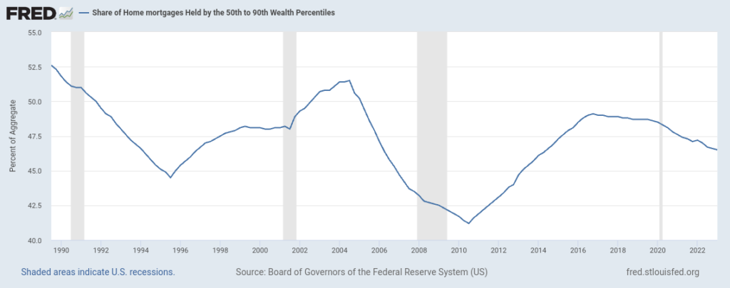 el siguiente gráfico muestra la proporción de hipotecas residenciales que son propiedad del 40% de la población que se encuentra entre el 50% y el 90% más rico en términos de riqueza. Es decir, desde el percentil 50 al 90.