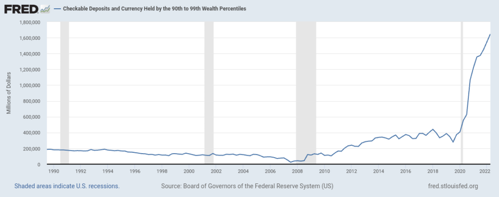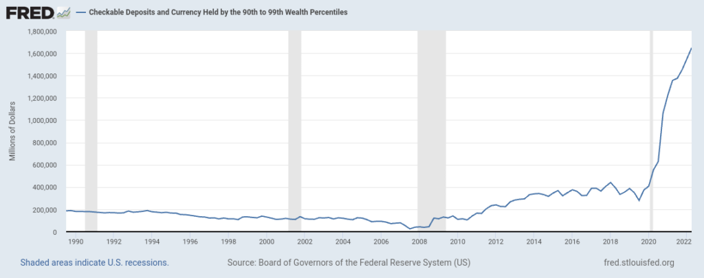 Se refiere a la cantidad de dinero en forma de depósitos bancarios que son propiedad del 9% de la población que se encuentra justo debajo del 1% más rico, así como la cantidad de moneda física (billetes y monedas) que tienen en su posesión. Esta medida también se utiliza para analizar la distribución de la riqueza y evaluar cuánto controla este grupo de individuos en términos de activos financieros líquidos.