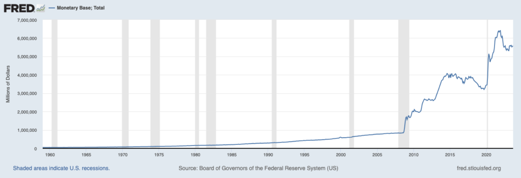 podemos ver en el siguiente gráfico como el dinero base en dólares creció después de 2008, cuando empezaron a realizar quantitative easing (comprando bonos americanos con dinero nuevo)