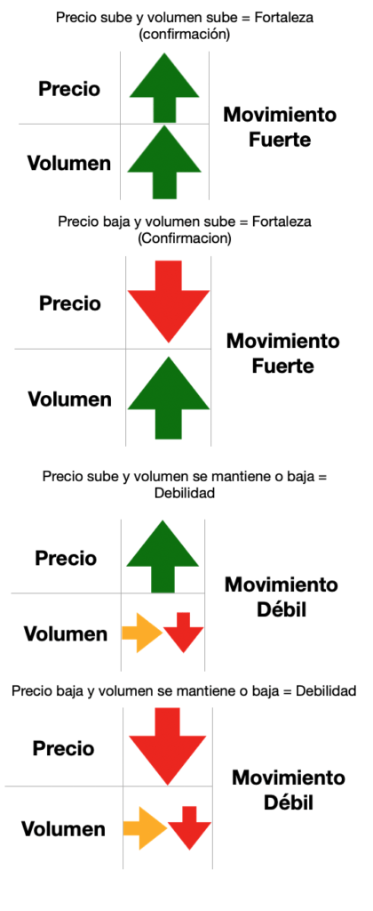 Básicamente el volumen confirma la fuerza o falta de ella en el cambio de precio. Un alto volumen indica gran fuerza y puede indicar que esa es la tendencia que seguirá el precio. Un volumen bajo indica que el movimiento de precio es débil y los participantes no tiene especial interés en que el activo vaya en esa dirección.