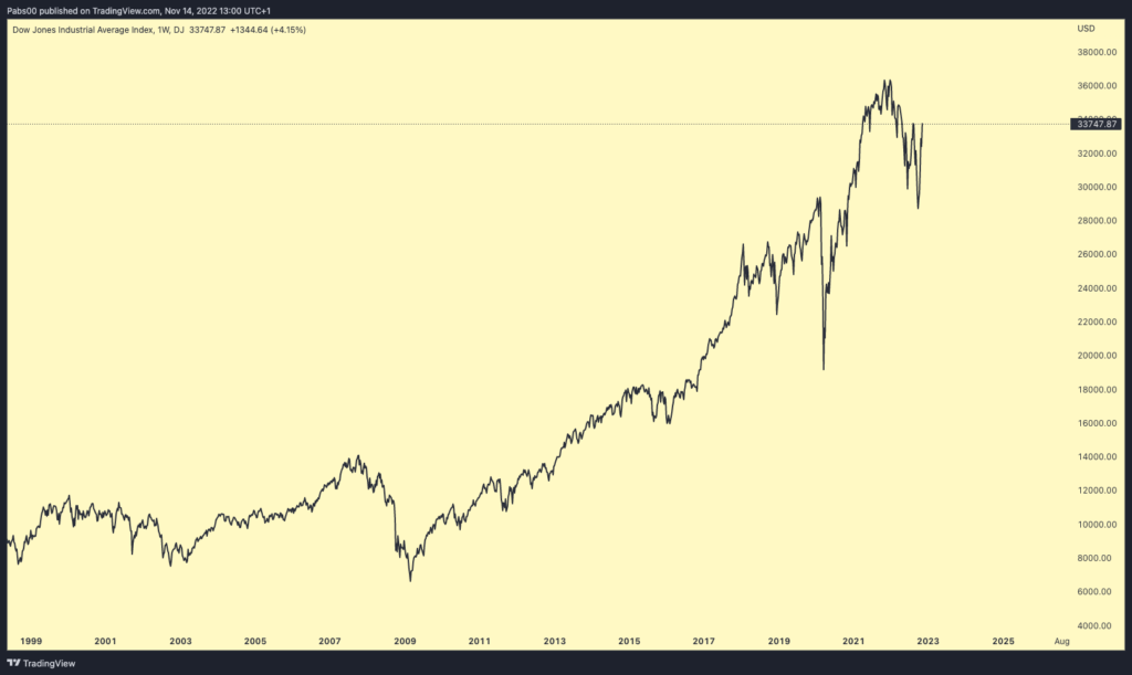 Por ejemplo mirando al Dow Jones Industrial Average verás movimientos más suave y tendencias más claras que mirando el gráfico de una empresa perteneciente al índice.