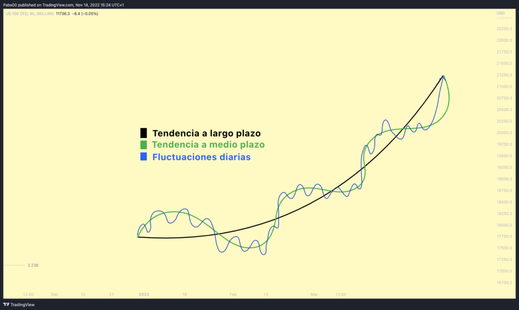 Una forma de ver esto más fácilmente sería tomando la tendencia a largo plazo como la marea, la de medio plazo las olas y las fluctuaciones diarias serían ondas del agua.