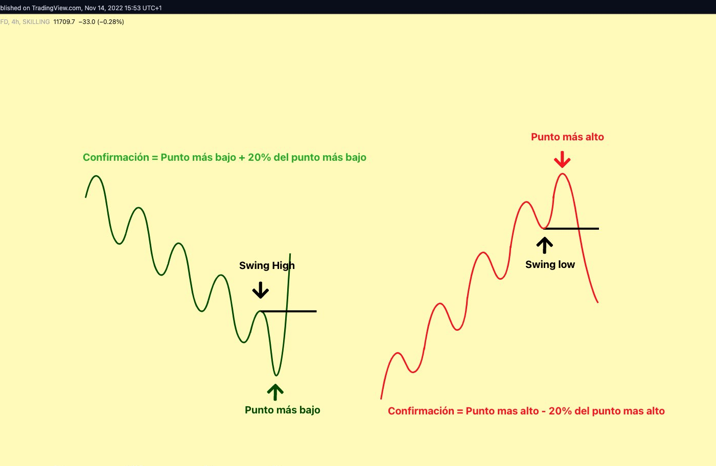 El segundo elemento sería la confirmación. Esta ocurre cuando el precio retrocede un 20% del swing high o swing low. Se calcula en una cambio de tendencia de bajista a alcista sumándole 20% al precio mas bajo al que se llego. En un cambio de tendencia alcista a bajista se le resta 20% al punto más alto al que el precio llegó.