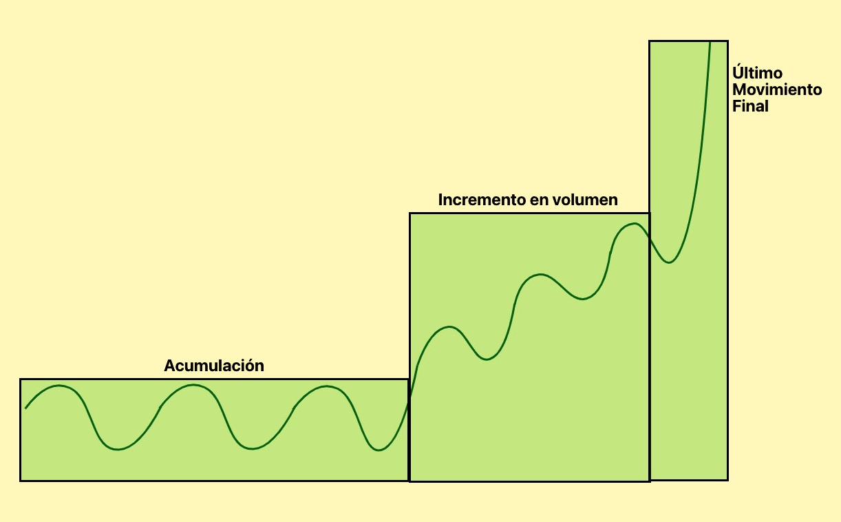 La acumulación es la primera fase de un mercado alcista. La característica más obvia de esta fase es que el precio se mueve horizontalmente por el gráfico antes de la tendencia alcista. Normalmente, esta fase se lleva acabo en valores que estén en descuento.