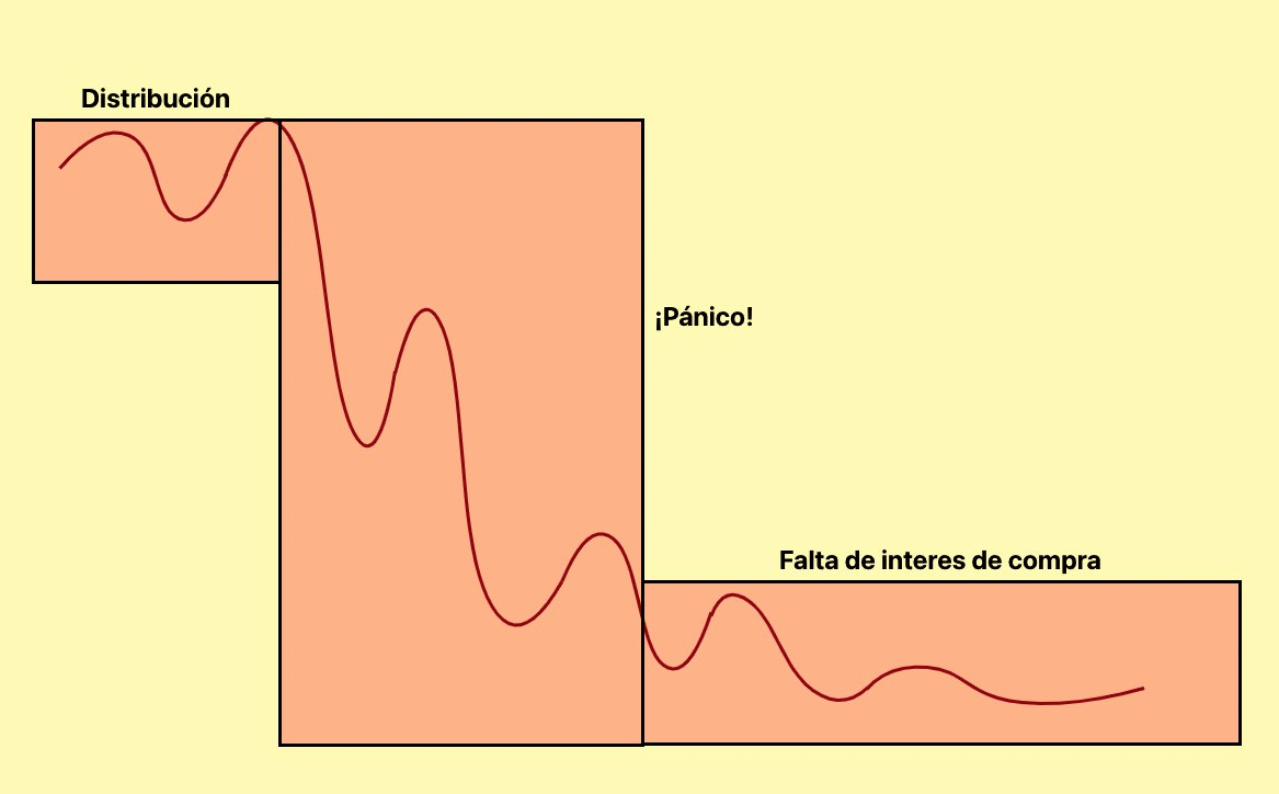 La característica más importante de esta fase es el pánico que sienten los compradores del activo al darse cuenta de que compraron a precios excesivamente altos y buscan cerrar su posición antes de perder demasiado capital. En términos generales el precio baja con mayor velocidad de lo que sube por el pánico es un sentimiento más fuerte que el optimismo y crea una sensación e urgencia.