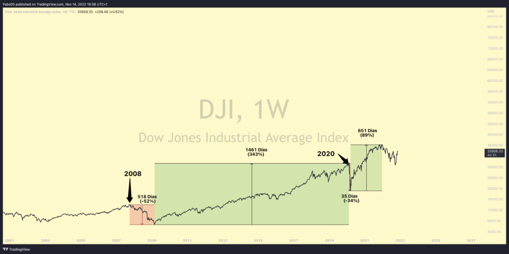 Cómo puedes observar la crisis del 2008 duro 518 días pero el mercado alcista duró hasta 2020 en una subida continuada. Luego bajo durante 35 días y volvió a un mercado alcista.