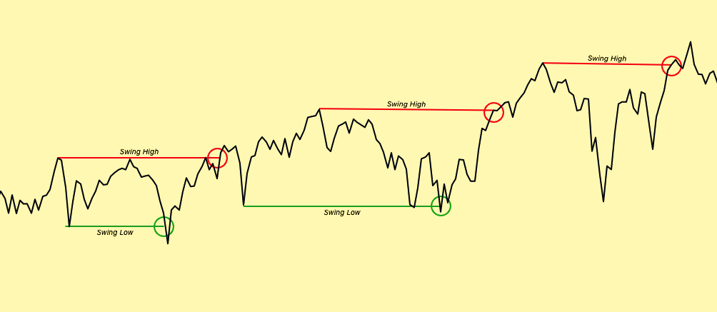 La primera es un movimiento del precio brusco en la dirección opuesta a la tendencia. La señal de que puede ocurrir un cambio de tendencia es cuando el precio supera un swing high (oscilación del precio a la alza) o swing low (oscilación del precio a la baja).